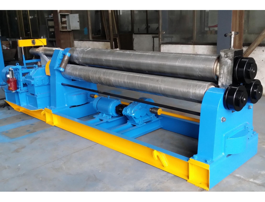 卷板機(jī)是將金屬板材卷彎成筒形、弧形或其它形狀工件的通用設(shè)備。三輥機(jī)械對稱式卷板機(jī)的下輥不能作水平移動,故工件端部的弧形必須經(jīng)過預(yù)彎,預(yù)彎可在折彎機(jī)或廠方自制工裝完成。板料經(jīng)兩端預(yù)彎后即開機(jī)卷筒。上輥升到板料可插進(jìn)在三輥之間,插進(jìn)板料后要注意板料兩側(cè)與輥?zhàn)虞S線的垂直性。可在自制的工作臺上作一導(dǎo)尺保證板料的正確位置。一切檢查完畢后,壓下上輥開始作業(yè),上輥點(diǎn)動,使板料作垂直方向微量位移,板料經(jīng)一個行程后開始彎曲,此時使下輥反轉(zhuǎn)。再次點(diǎn)動上輥向下微量位移,這樣周而復(fù)始,不斷來回輾轉(zhuǎn)直至筒口閉合。停車,升起上輥,壓下上輥尾端使上輥微微抬起,拔下翻倒座插銷,拉下翻倒座,制品即可從機(jī)上取下。